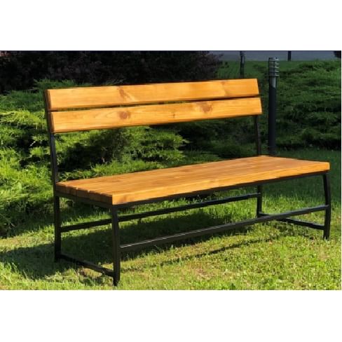 Основание скамьи представляет собой металлический каркас, для сидения и спинки используется деревянный брус (доска).