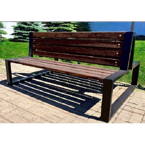 Основание скамьи представляет собой металлический каркас, для сидения и спинки используется деревянный брус (доска).