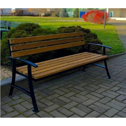 Основание скамьи представляет собой металлический каркас, для сидения и спинки используется деревянный брус (доска).
