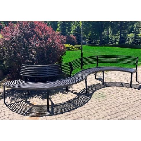 Основание скамьи представляет собой металлический каркас, для сидения и спинки используется деревянный брус (доска).
